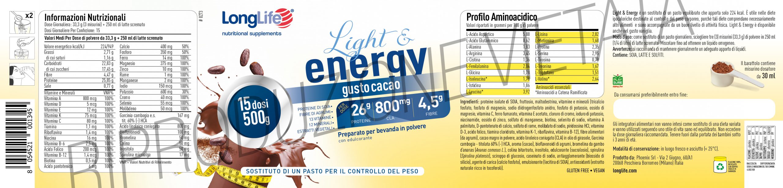 Light&Energy indicated for low calorie diets intended for body weight control, as long as these diets necessarily include other foodstuffs and are accompanied by adequate physical exercise. Light & Energy is also available with vanilla flavour.