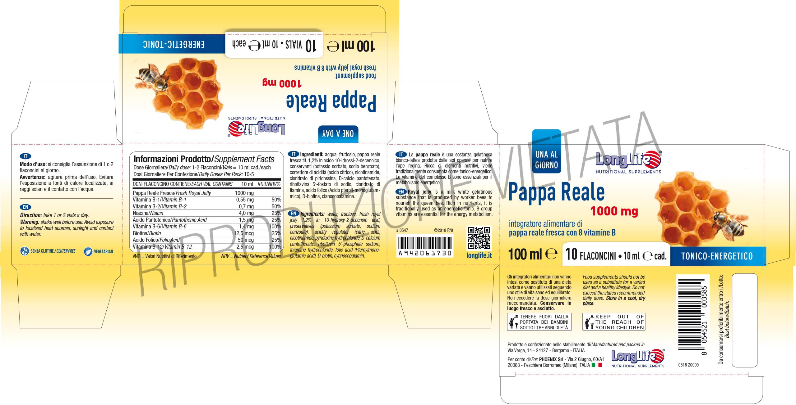Fresh royal jelly, liquid, in convenient single dose vials, enriched with 8 B group vitamins.